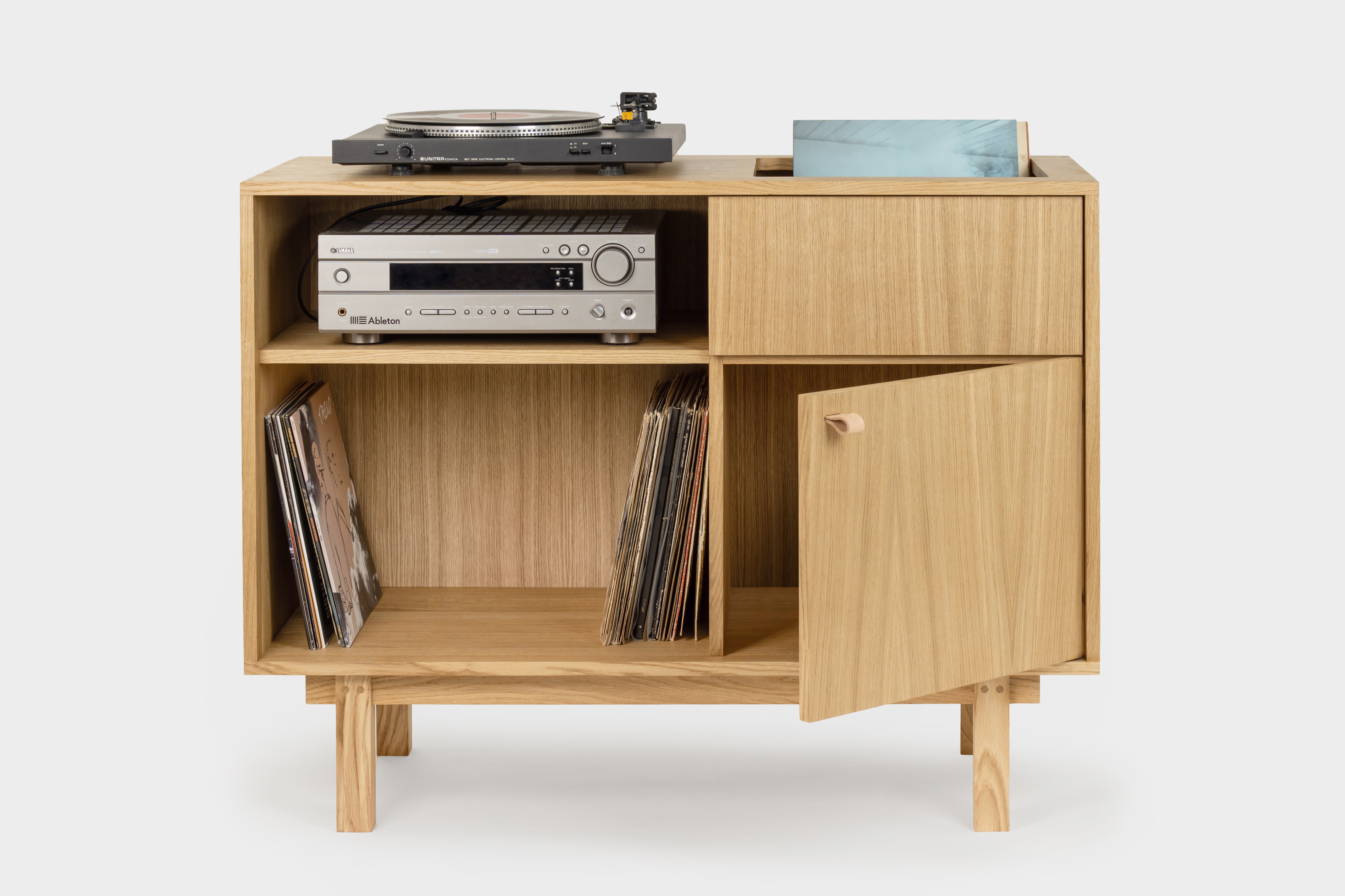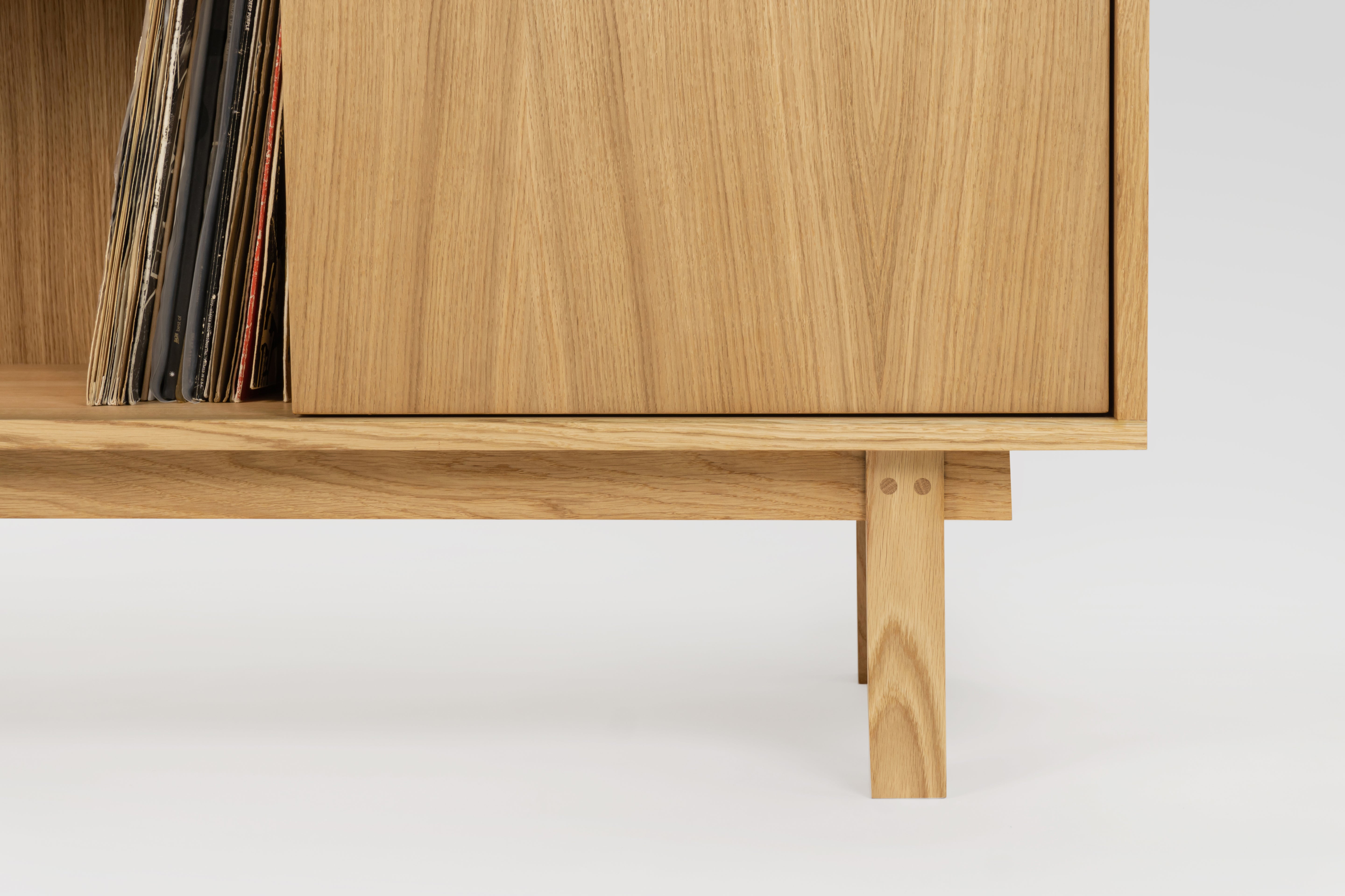 Praktyczność i styl idą w parze - ta szafka oferuje łatwy dostęp do kolekcji płyt winylowych, dzięki czemu przeglądanie płyt długogrających jest przyjemnym doświadczeniem. Nowoczesny, wyrafinowany design sprawia, że mebel ten stanie się centralnym punktem każdego pomieszczenia, podkreślając jego wyjątkową osobowość.
