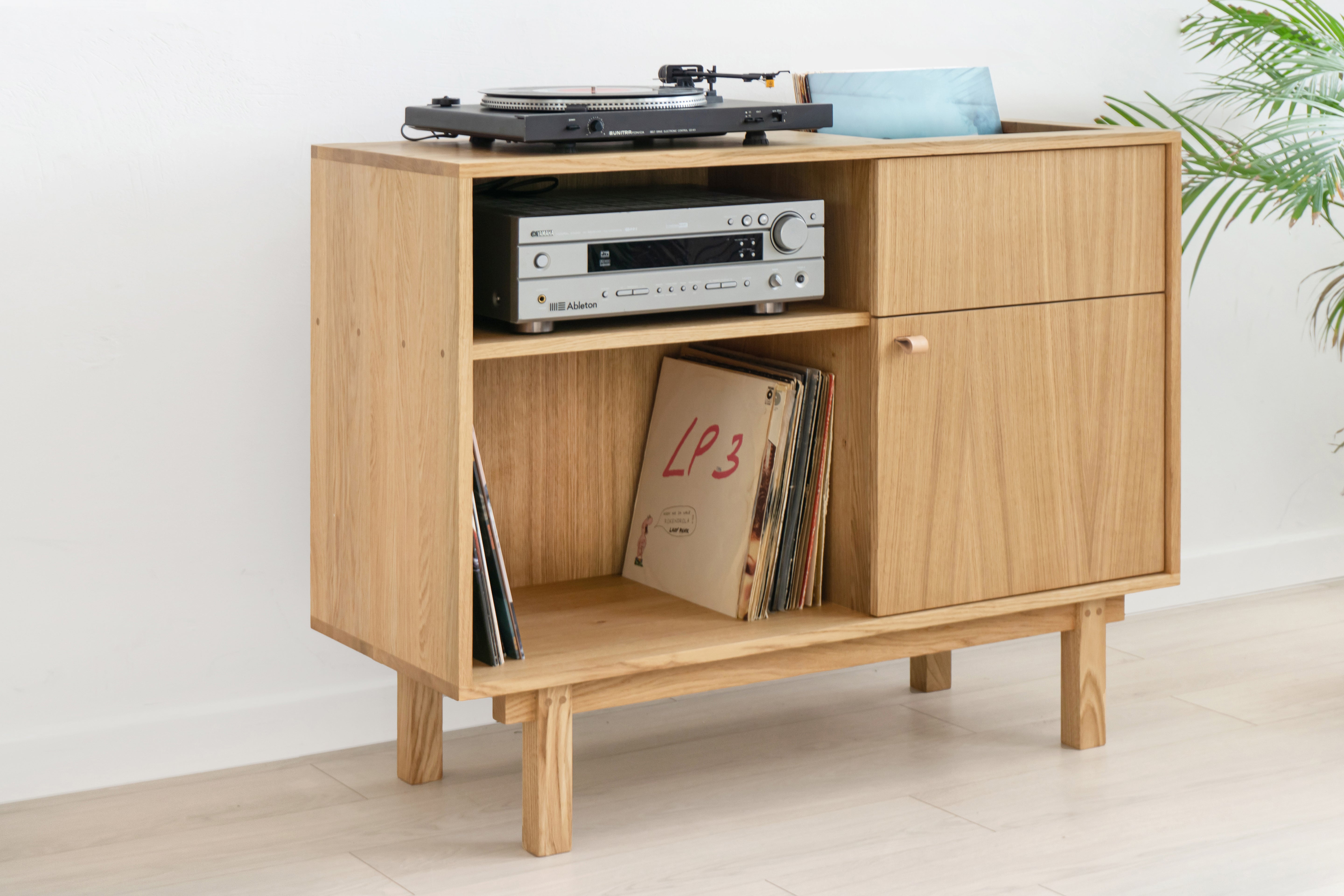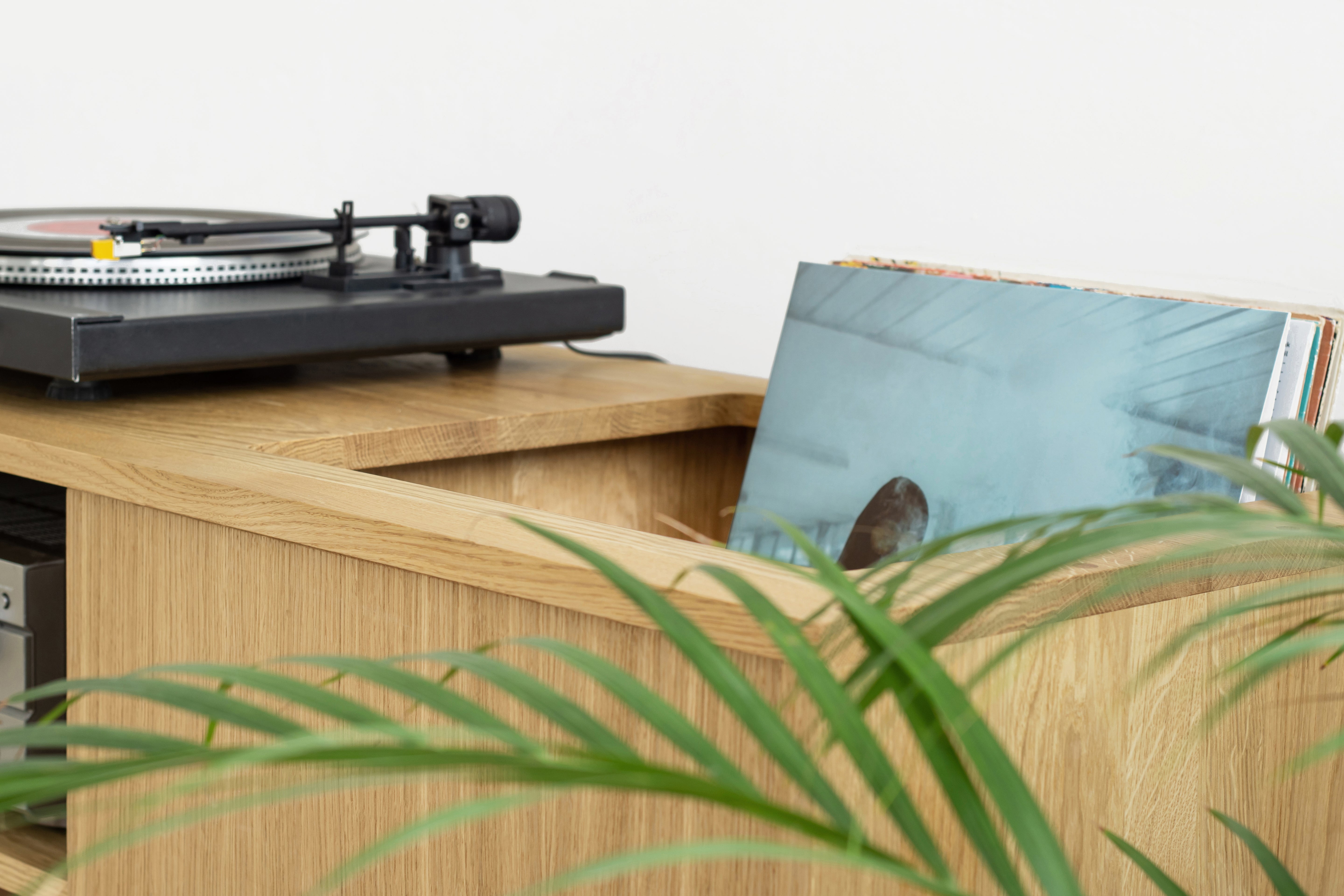 Szafka na płyty winylowe z litego drewna dębowego to idealny wybór dla tych, którzy cenią sobie jakość i design na miarę. Ten wyjątkowy mebel został wykonany z myślą o przechowywaniu płyt winylowych, a jednocześnie służy jako elegancki stojak na gramofon lub nowoczesną konsolę multimedialną Hi-Fi. Ciepłe, naturalne odcienie dębu pięknie komponują się z minimalistycznym, czystym designem, dodając ponadczasowego charakteru każdej przestrzeni.